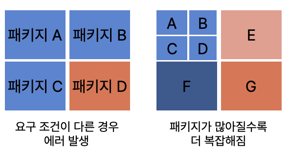 패키지 간의 의존성이 크기 때문에 A는 B를 쓰고, B는 C를 쓰고 C는 B를 쓰는데, D는 A가 있으면 안 되고… 하는 일이 많이 발생합니다.