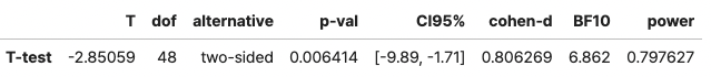 (위 실험 결과를 보면, t(48) = -2.85059, p<0.01, 95% 신뢰구간에서 [-9.89, -1.71])