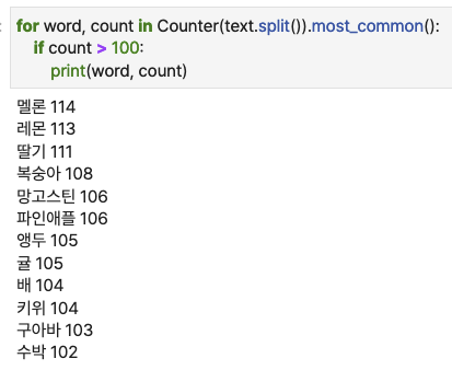 - 리스트 안에 있는 문자(단어)의 빈도를 센다(리스트를 넣어 줬을 때)