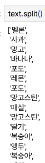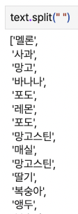 위 명령어를 수행하면 text에 있는 문자열을 " "(공백) 단위로 나눠서 리스트로 만들어 주는 것이지요. 결과를 확인해 볼까요?