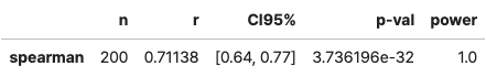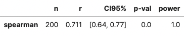 r = 0.711, p-value<0.005, 신뢰구간 95%에서 [0.64, 0.77]로 두 변수 사이의 관계가 유의하다. (스피어만)