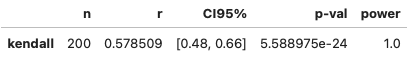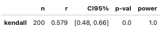 r = 0.579, p-value<0.005, 신뢰구간 95%에서 [0.48, 0.66]로 두 변수 사이의 관계가 유의하다. (켄달)