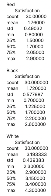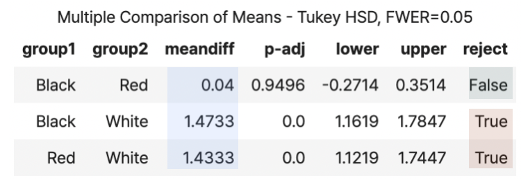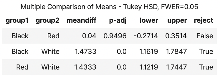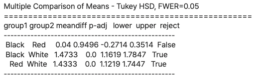이제 우리는 1) Black~White 2) Red~White 집단이 유의한 차이가 나는 집단이고 1) Black~Red 집단은 차이가 나지 않는다는 사실을 알았습니다.