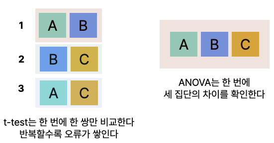 "잠깐, 아까는 t-test를 반복(두 집단의 비교)하면 오류가 올라간다고 하지 않았나요?"