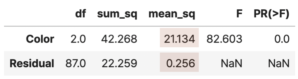 간단하게 말해 21.134/0.256 = 82.5546875 가 F값의 연산 결과와 같다는 것입니다.