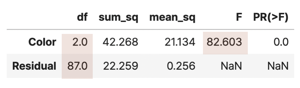 여기서 분석결과는 F(2,87) = 82.603과 같습니다.