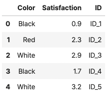 오늘 사용할 (가상) 샘플 데이터는 제품 색상과 만족도를 조사한 내용입니다.