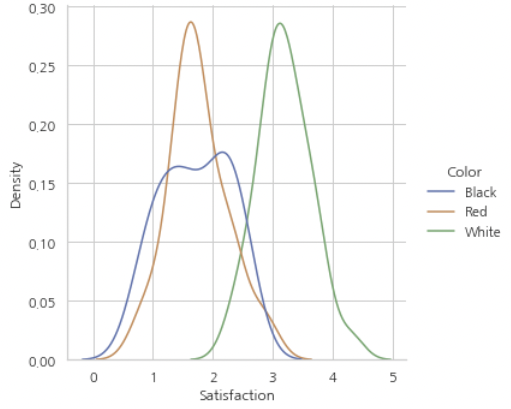 우리는 "각 제품 특성(색상)" 에 따라 데이터의 분포가 어떻게 형성되는 지 확인하는 것이 목표이므로 밀도함수에 색상별 구분 파라메터를 넣어주면 됩니다.
