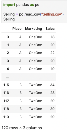 샘플 데이터는 1) 지역 2) 마케팅 전략(1+1 vs 2+1)에 따른 판매량 변화 데이터 입니다.