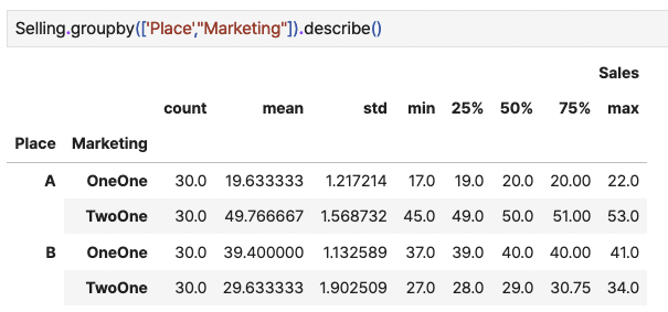 다음과 같이 간단하게 describe() 명령을 구성하여 각 그룹별 기술분석을 수행해 보겠습니다.