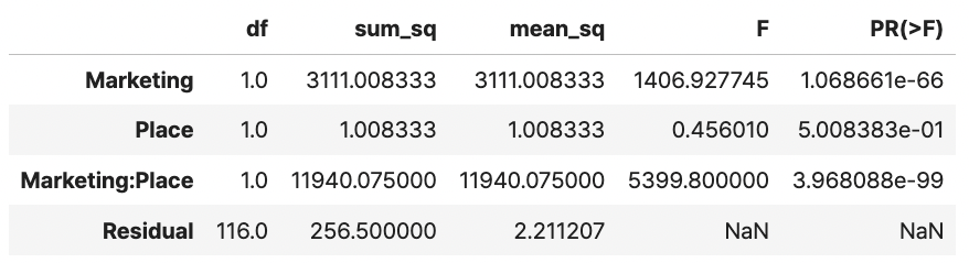 model = 'Sales ~ Marketing*Place'