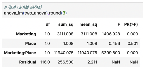 ANOVA 테이블의 해석은 이미 이전 포스팅에서 다뤘기 때문에, 같은 맥락에서 확인하면 됩니다.