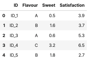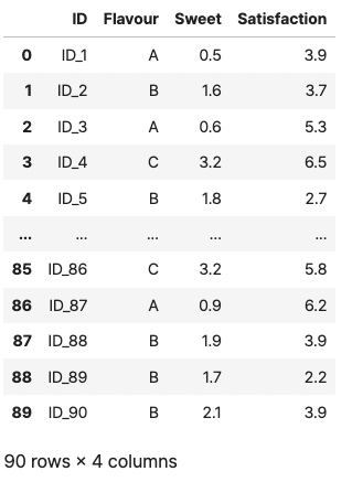 해당 데이터(실험)의 목적은 "향 or 풍미(Flavour)"에 따라 음료의 만족도(Satisfaction)가 유의미한 차이가 있을까?라는 점을 검증하는데 목적을 두고 있습니다.