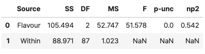 주요 변수(Flavour)가 유의하다는 점은 변하지 않았지만, 이를 계산하는 과정에서 관련 통계 수치(분산, F값)이 변화된 것을 확인할 수 있습니다.