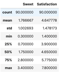 당도(Sweet)는 향과 관계가 없지만, 만족도에 유의미한 영향을 미칠 것으로 생각되는 변수이기에 연구자는 공분산분석(ANCOVA)을 사용하기로 통계 분석 과정을 설계했습니다.