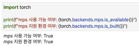 print(f"mps 지원 환경 여부: {torch.backends.mps.is_built()}")